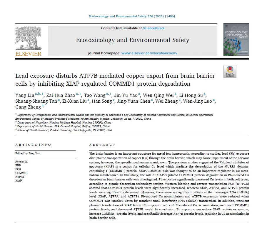 神经内科医生刘杨,在研究中深入探究了铅暴露与神经系统损伤之间的病理机制,通过在国际期刊《Ecotoxicology and Environmental Safety》发表的论文“Lead exposure disturbs ATP7B-mediated copper export from brain barrier cells by inhibiting XIAP-regulated COMMD1 protein degradation”,揭示了铅暴露对大脑屏障细胞中ATP7B介导的铜排出的影响。研究结果表明,铅暴露会降低XIAP蛋白表达,增加COMMD1蛋白水平,并特别降低ATP7B蛋白水平,从而导致铜在脑屏障细胞中积聚。这一发现对于神经系统疾病的治疗和预防提供了新的理论基础,有望为相关疾病的临床实践提供新的思路和策略。